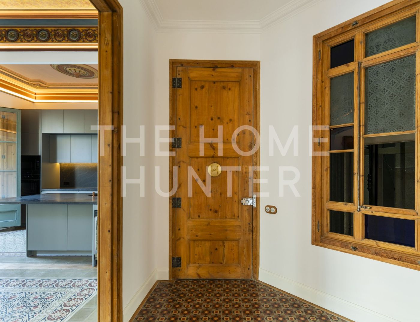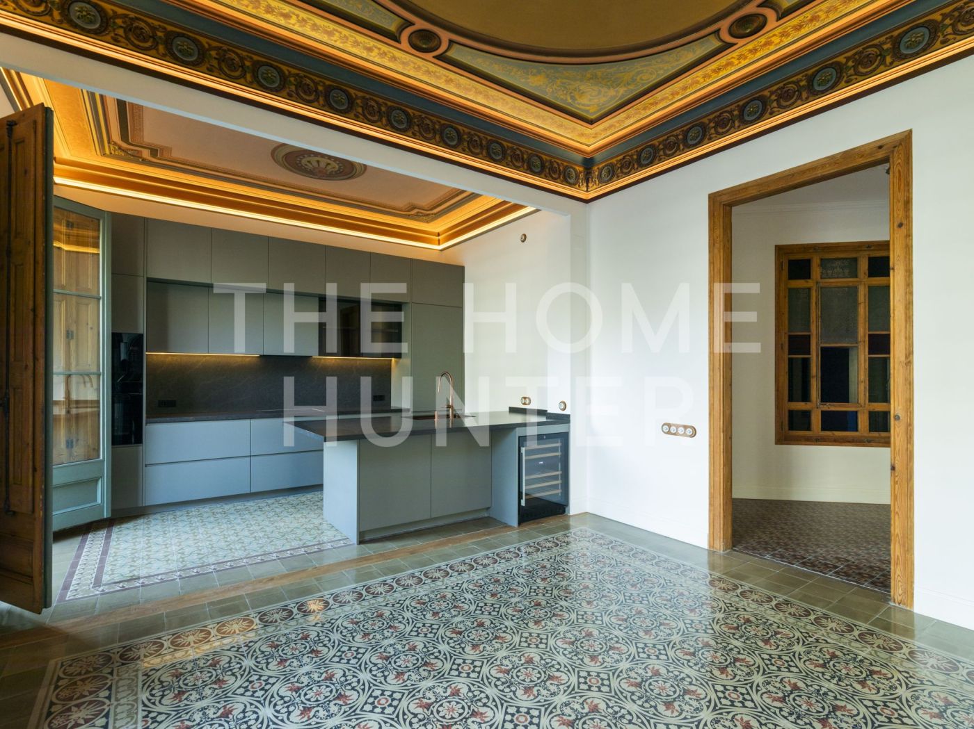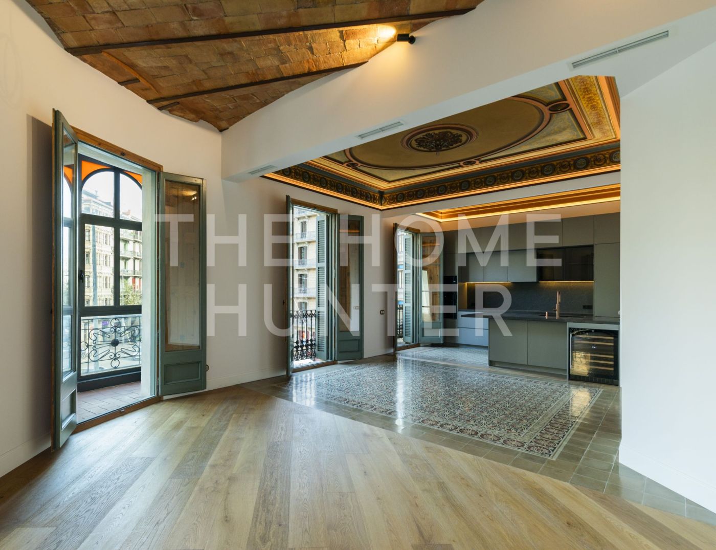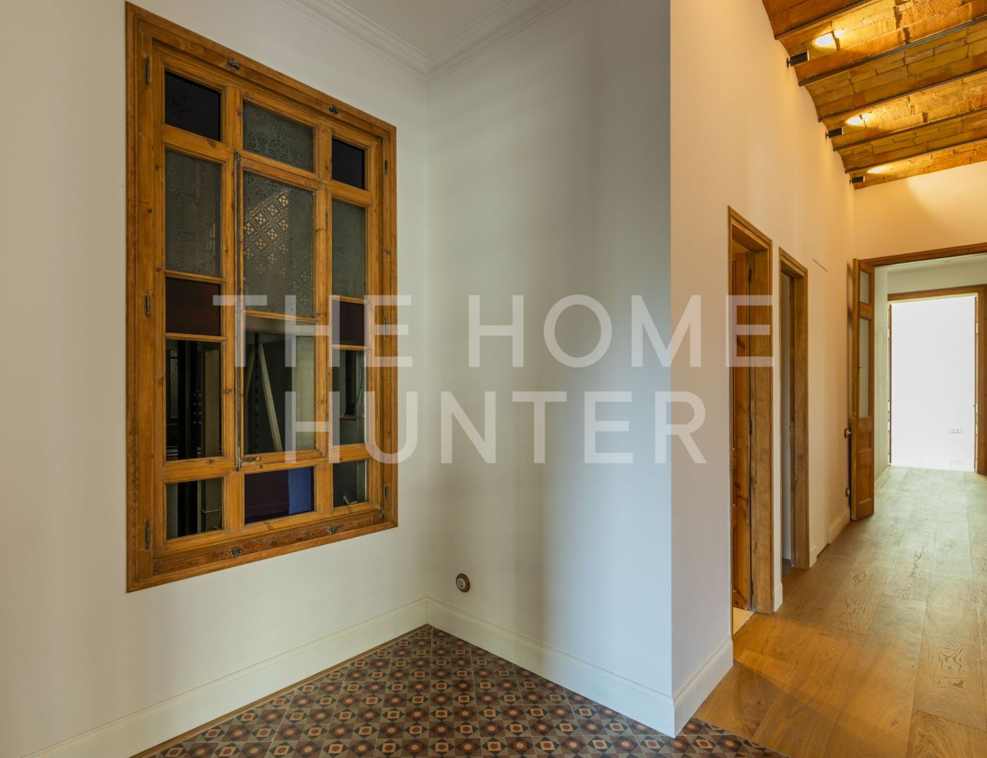 El amplio salón comedor se convierte en el corazón de la vivienda, con salida directa a una galería exterior con vidriera original totalmente recuperada, que baña el espacio de luz natural y carácter. Los suelos hidráulicos originales, los techos restaurados artesanalmente y las impresionantes alturas de hasta 3,40 metros con bóveda catalana conservada en algunas estancias elevan la experiencia de vivir aquí.