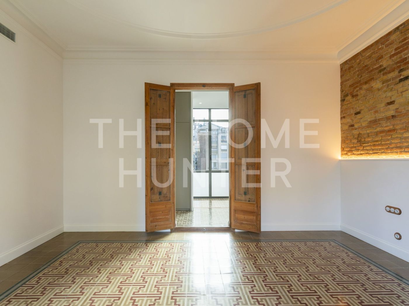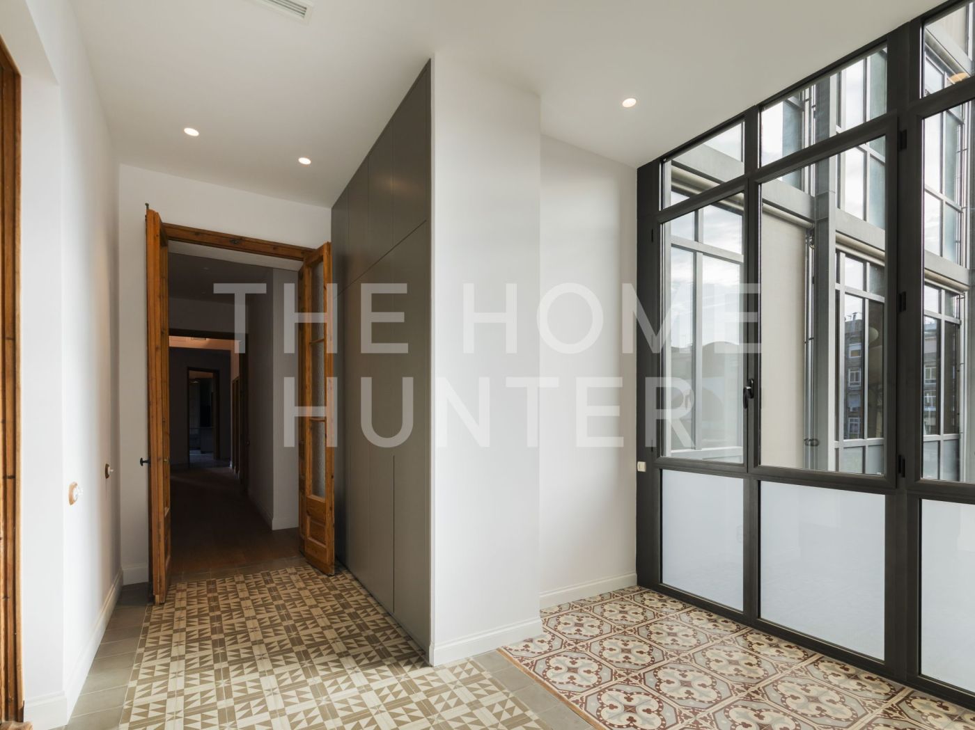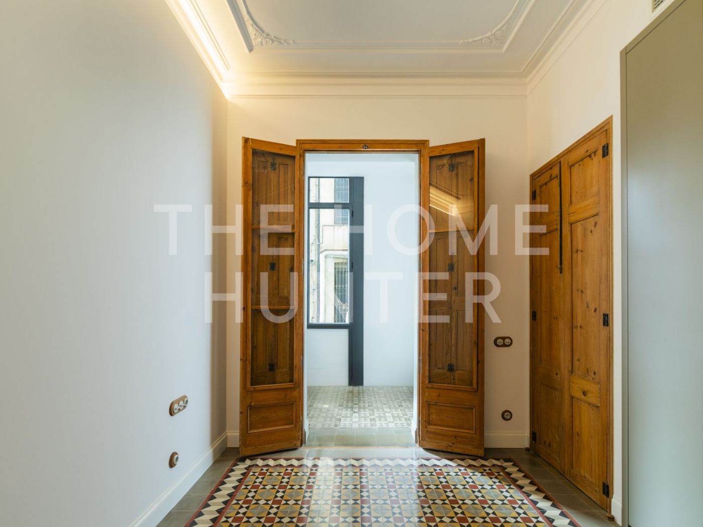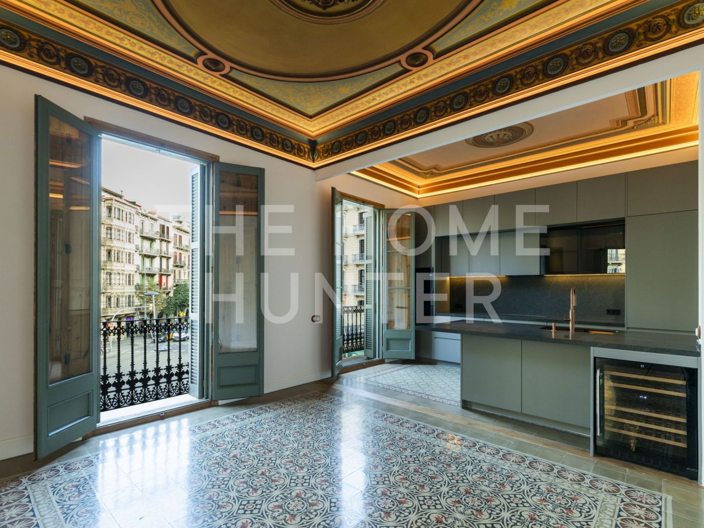 El amplio salón comedor se convierte en el corazón de la vivienda, con salida directa a una galería exterior con vidriera original totalmente recuperada, que baña el espacio de luz natural y carácter. Los suelos hidráulicos originales, los techos restaurados artesanalmente y las impresionantes alturas de hasta 3,40 metros con bóveda catalana conservada en algunas estancias elevan la experiencia de vivir aquí.