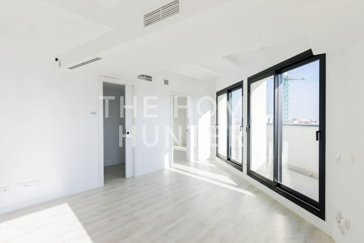 Este piso tiene 106,14m² repercutidos, divididos en 61,82m² de piso y 44,32m² de terraza. Es una novena planta y es una obra nueva de 2024. Tiene un dormitorio doble, armarios empotrados, un baño completo, amplio salón-comedor y cocina abierta y equipada con electrodomésticos Bosch. Cuenta con ventanas de climalit doble, aire acondicionado y aerotermia. La finca es eco-eficiente y tiene ascensor.