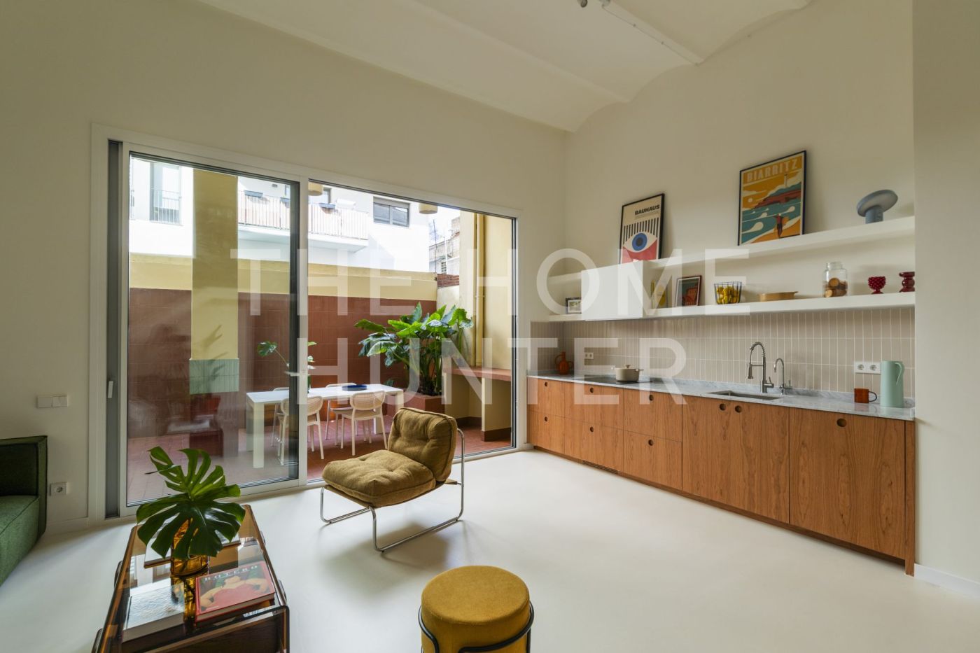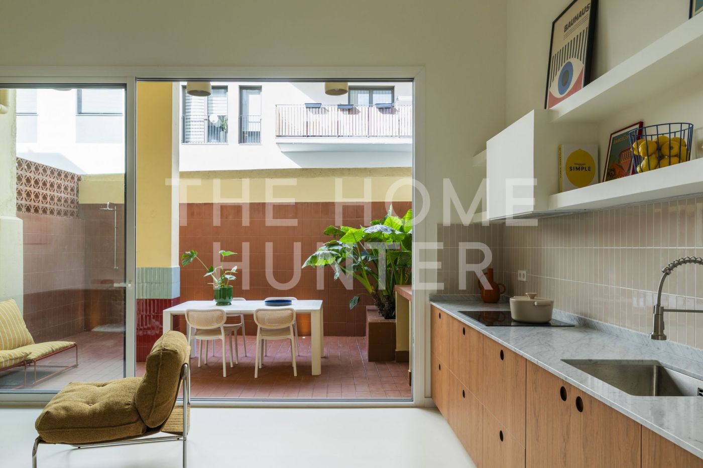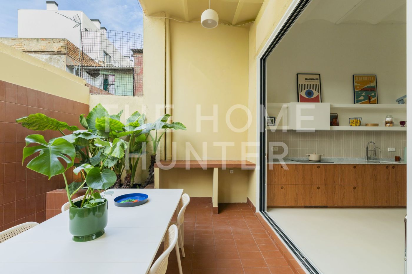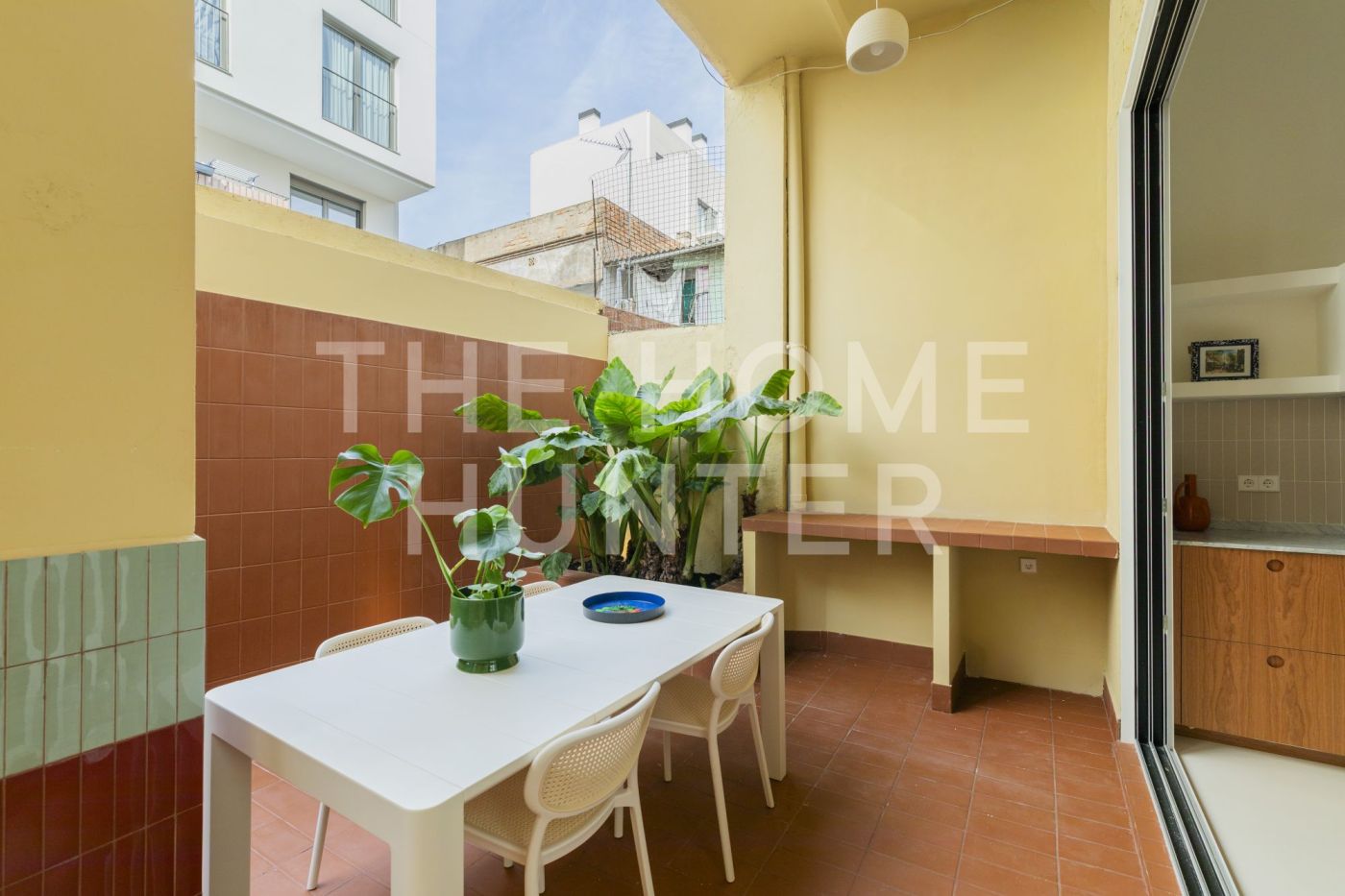 Desde el salón accedemos a un patio privado de 10 m², un auténtico oasis urbano: un espacio versátil que cuenta con zona de lavandería, encimera de obra perfecta para comidas en grupo y una agradable área chill out.
