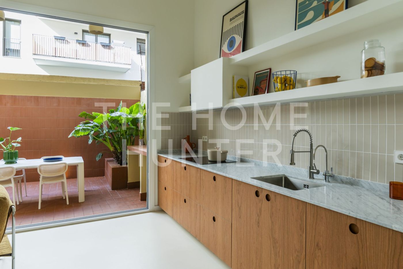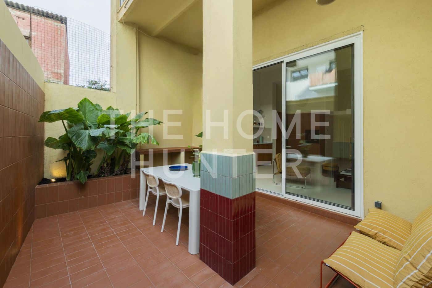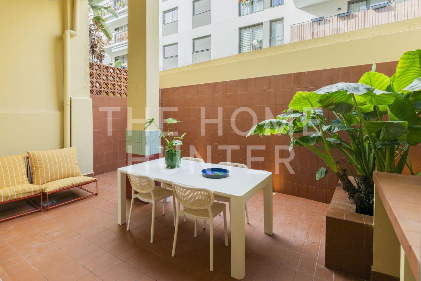 Desde el salón accedemos a un patio privado de 10 m², un auténtico oasis urbano: un espacio versátil que cuenta con zona de lavandería, encimera de obra perfecta para comidas en grupo y una agradable área chill out.