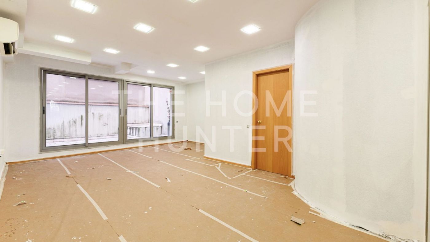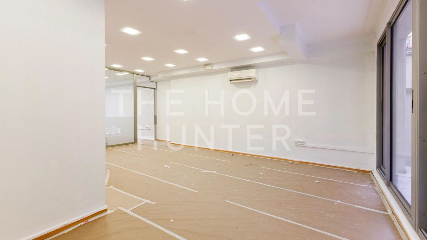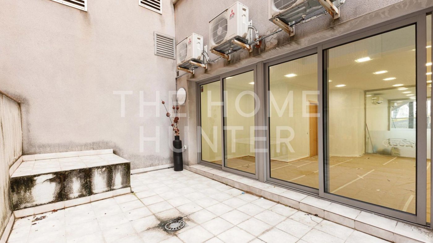 La planta principal cuenta con un espacio diáfano con pequeñas separaciones acristaladas, que generan tres zonas de trabajo diferenciadas, además de un aseo. En la planta superior se completa la distribución con más superficie útil para despachos o áreas de apoyo. La oficina dispone también de un patio privado de 25 m², que aporta luz natural y un espacio exterior poco habitual en este tipo de inmuebles.