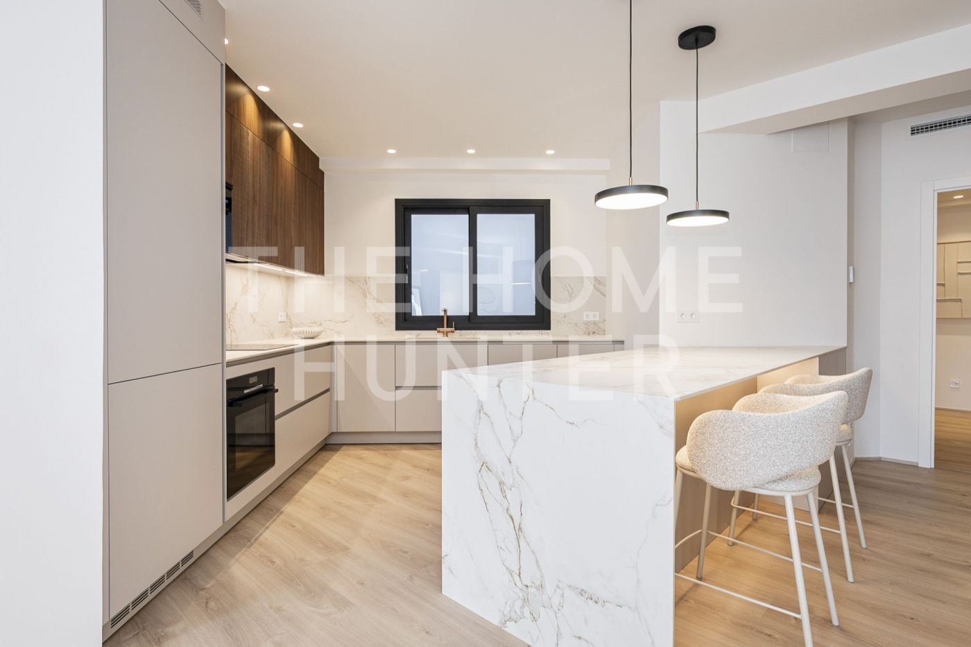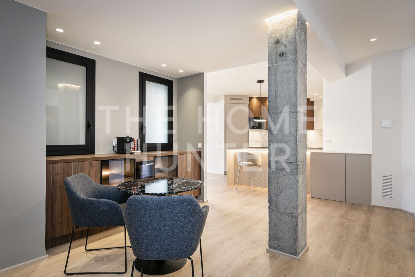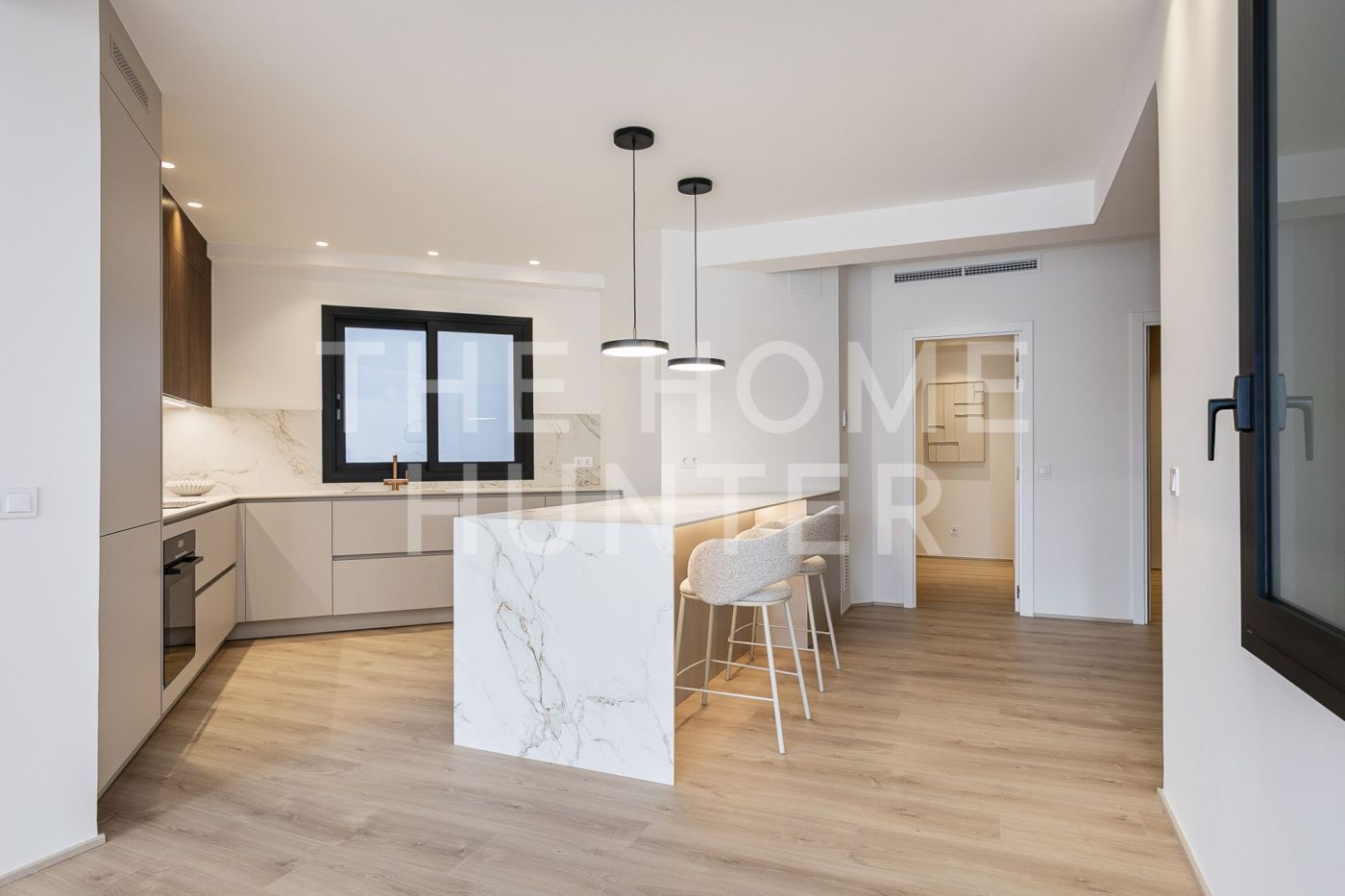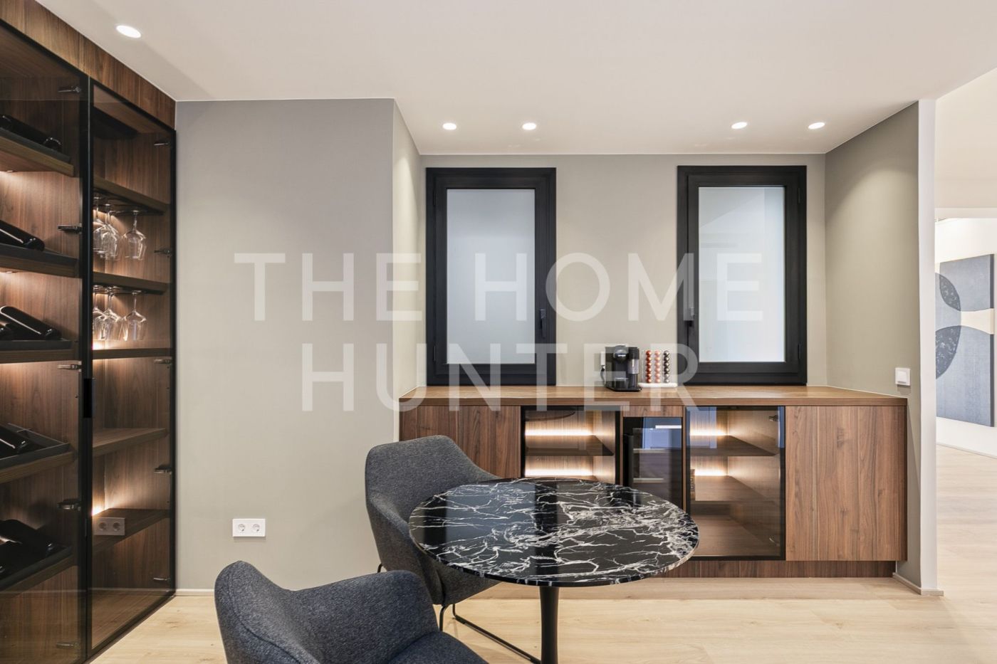 The jewel of the apartment is a 90 m² living–dining room, a stunning, super bright space with direct access to a terrace where life flows effortlessly. The open kitchen with an island is one of those that make you want to cook even if you don’t enjoy it. It’s fully equipped, beautiful, and connects to the heart of the home. It also has a coffee area and a wine corner, because priorities must be clear.