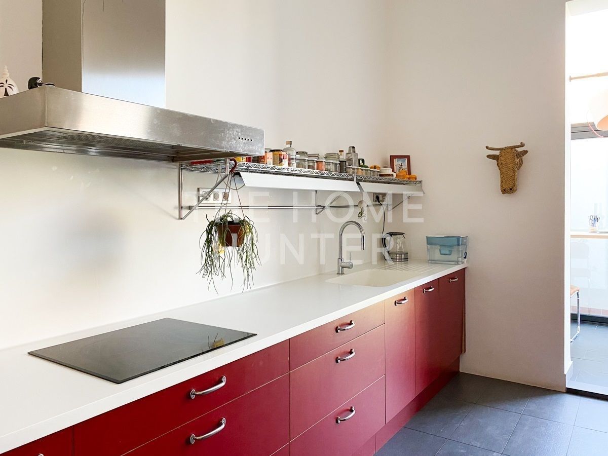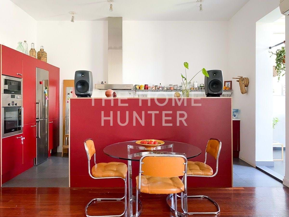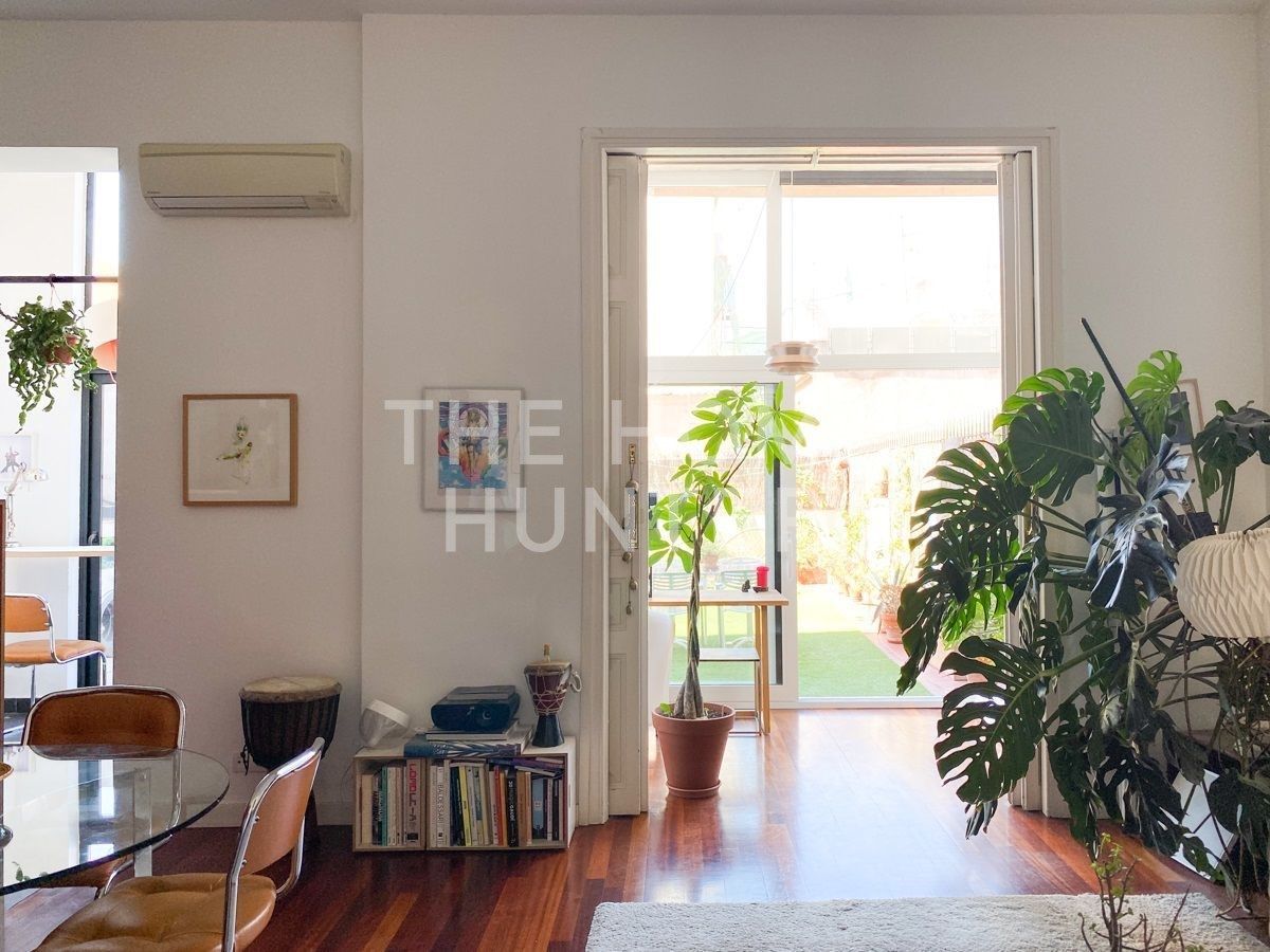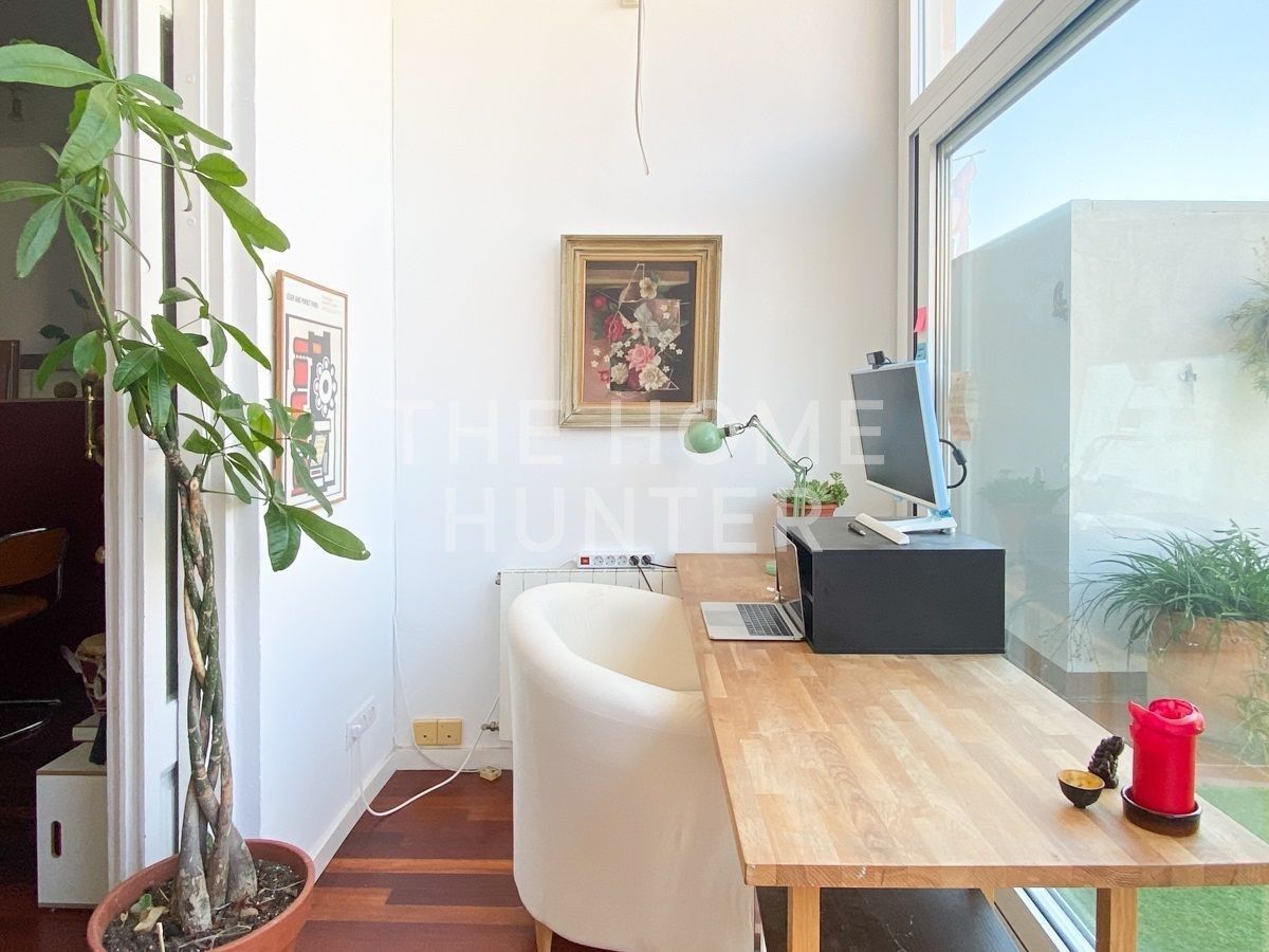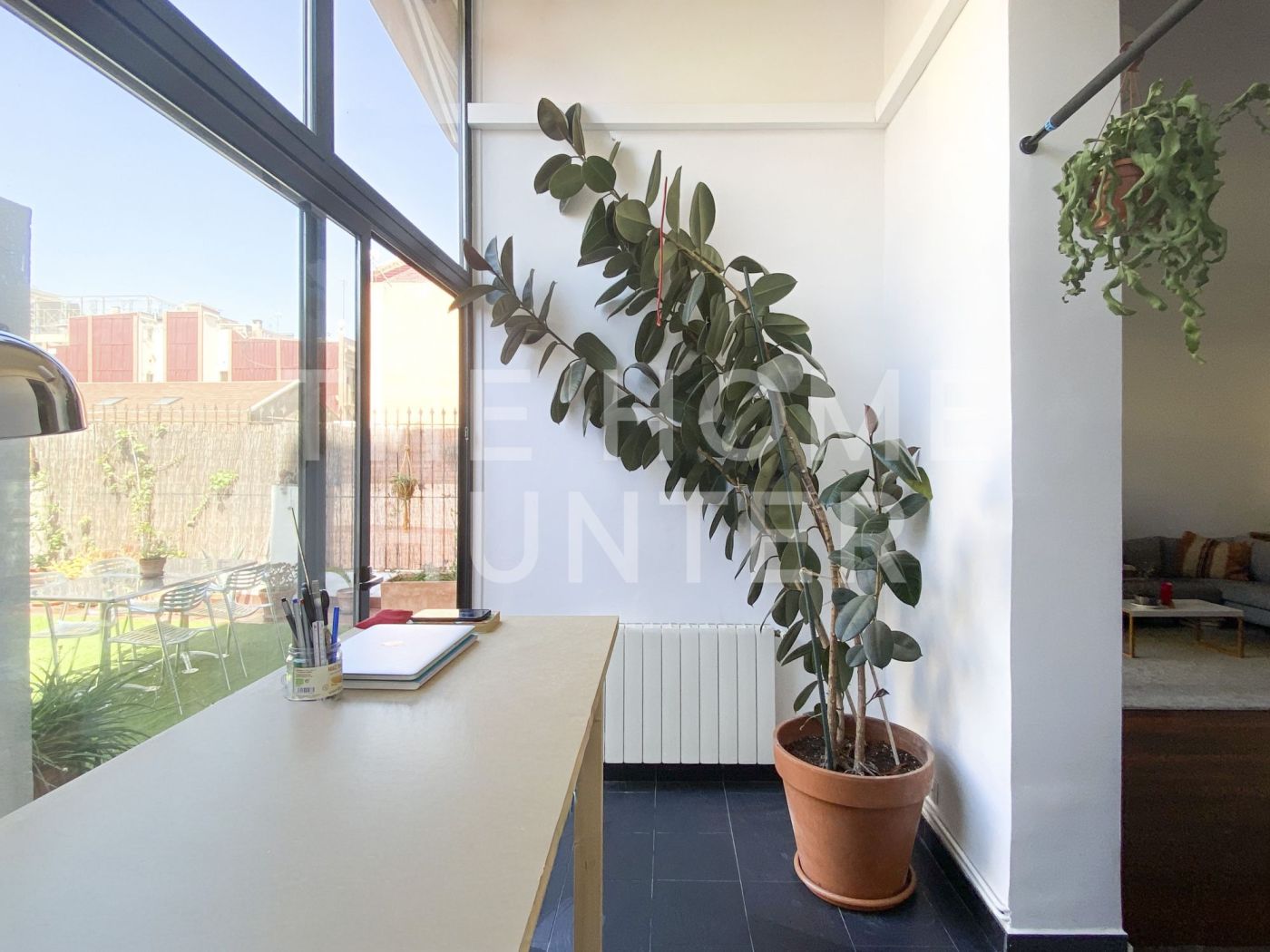 The flat is on the 1st floor and measures 120 m². The living-dining room and the kitchen are wonderful, sharing the same space, and from both, you can step out onto this beautiful 60 m² terrace. But before going outside, there are 2 studies, one to the right and one to the left, both leading to the garden. They are spaces full of light, life, plants, and tranquility. Toward the sleeping area, a hallway leads to 3 bedrooms, one of them with an en-suite bathroom, two sharing a 5 m² patio, and finally another bathroom. The flat is rented unfurnished.