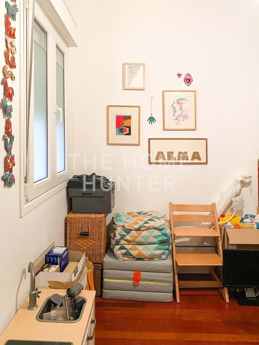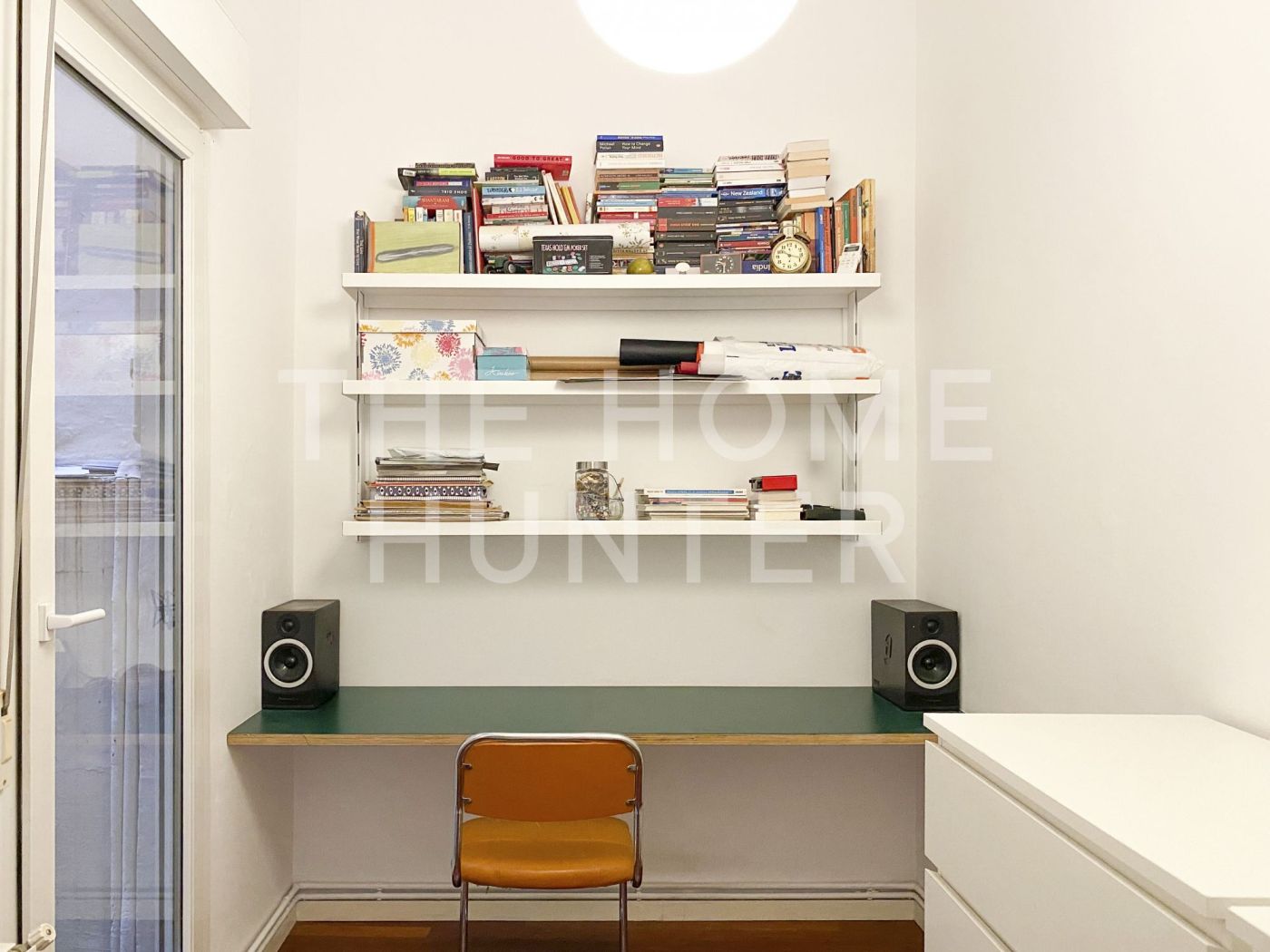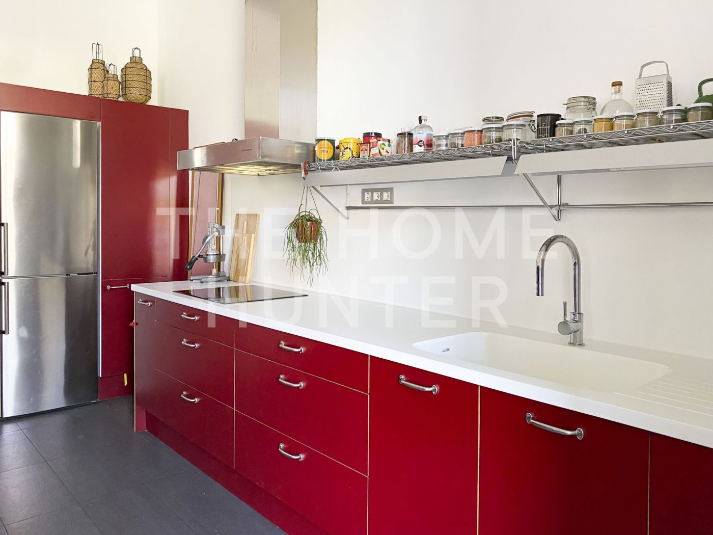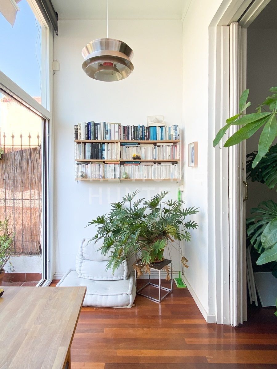 The flat is on the 1st floor and measures 120 m². The living-dining room and the kitchen are wonderful, sharing the same space, and from both, you can step out onto this beautiful 60 m² terrace. But before going outside, there are 2 studies, one to the right and one to the left, both leading to the garden. They are spaces full of light, life, plants, and tranquility. Toward the sleeping area, a hallway leads to 3 bedrooms, one of them with an en-suite bathroom, two sharing a 5 m² patio, and finally another bathroom. The flat is rented unfurnished.