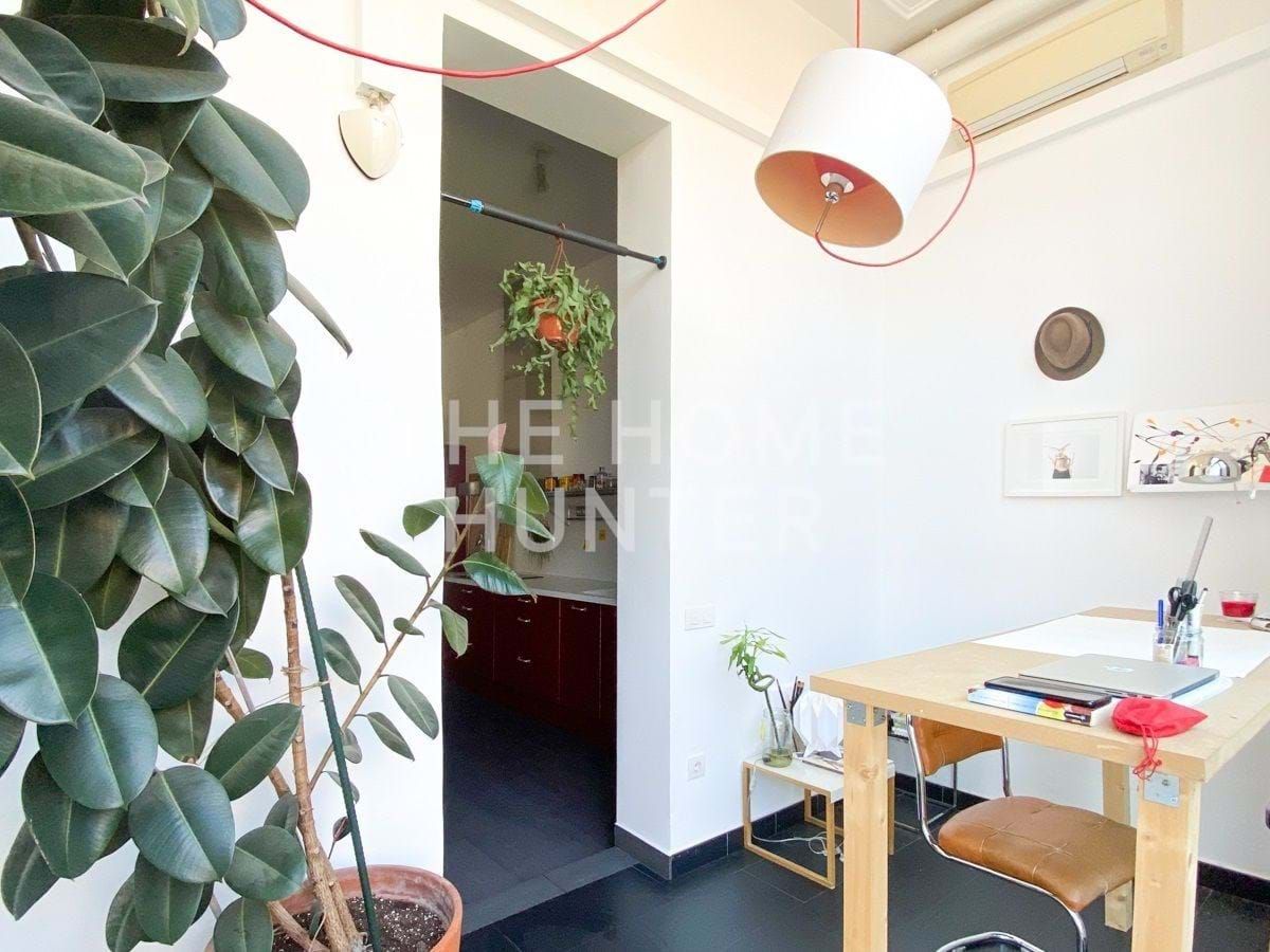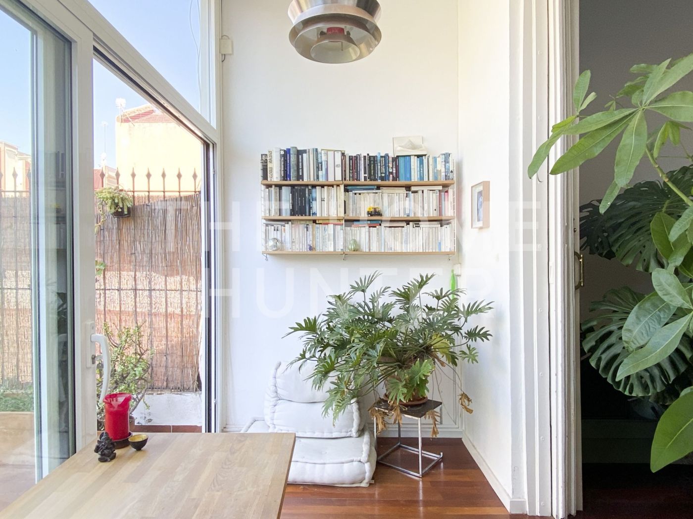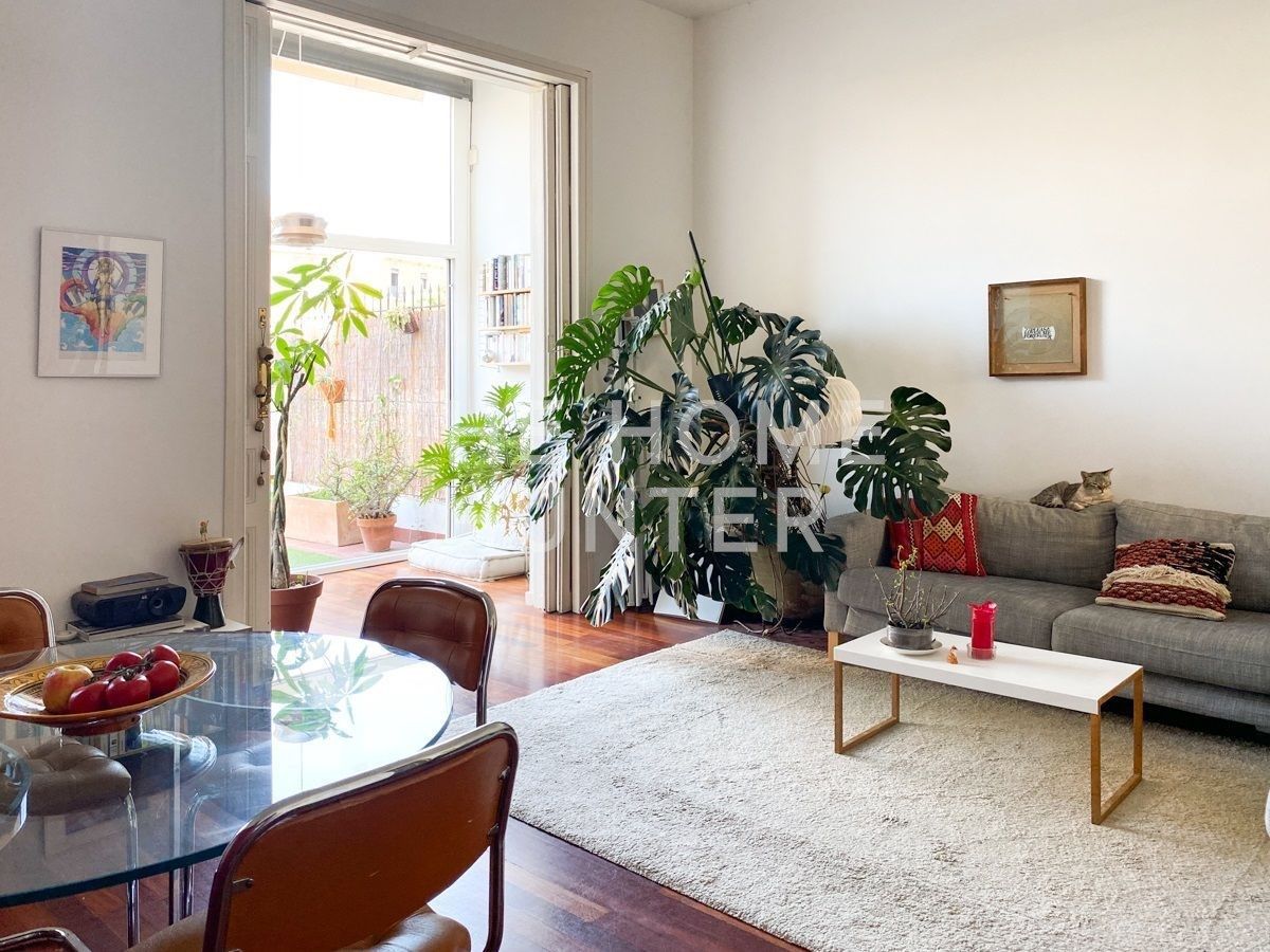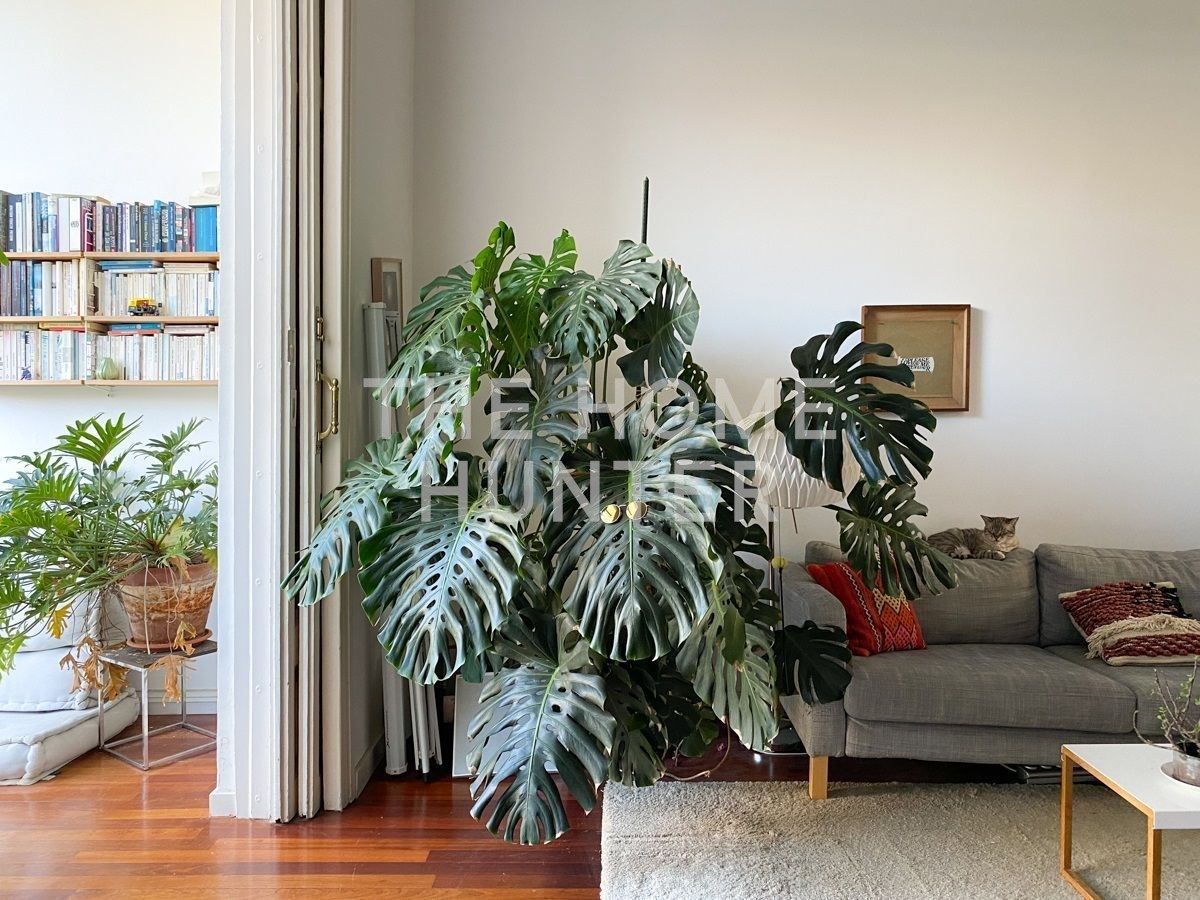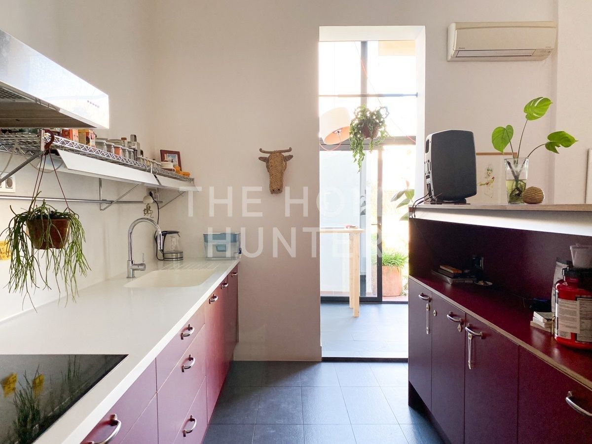 The flat is on the 1st floor and measures 120 m². The living-dining room and the kitchen are wonderful, sharing the same space, and from both, you can step out onto this beautiful 60 m² terrace. But before going outside, there are 2 studies, one to the right and one to the left, both leading to the garden. They are spaces full of light, life, plants, and tranquility. Toward the sleeping area, a hallway leads to 3 bedrooms, one of them with an en-suite bathroom, two sharing a 5 m² patio, and finally another bathroom. The flat is rented unfurnished.