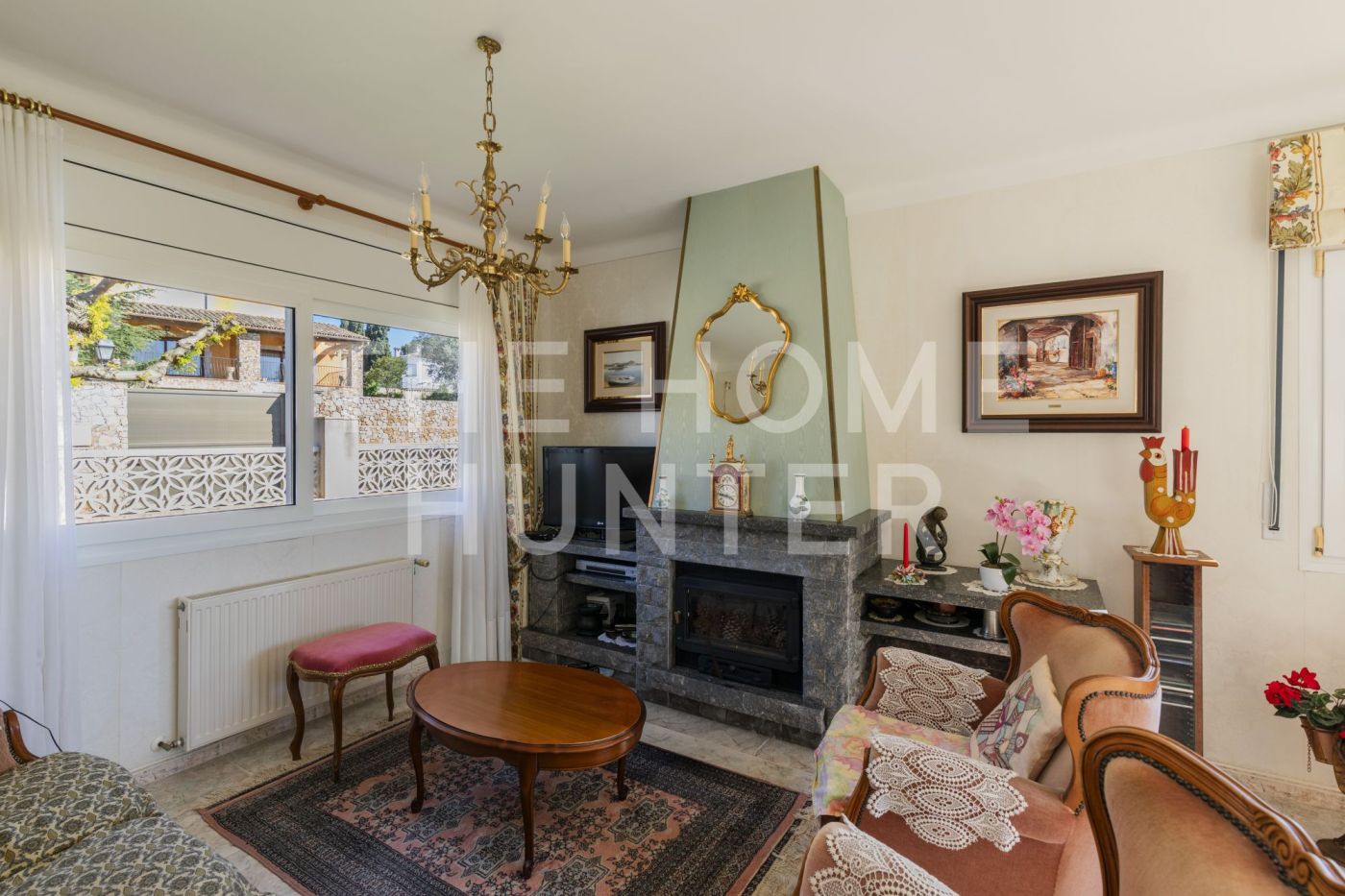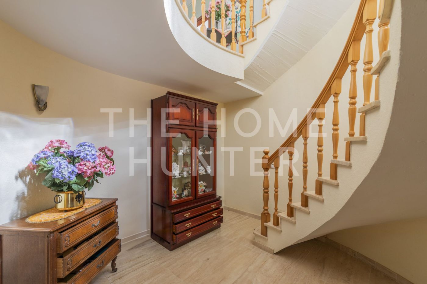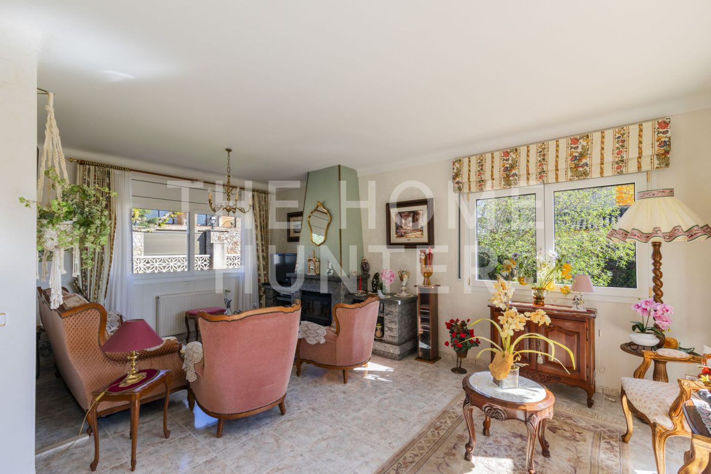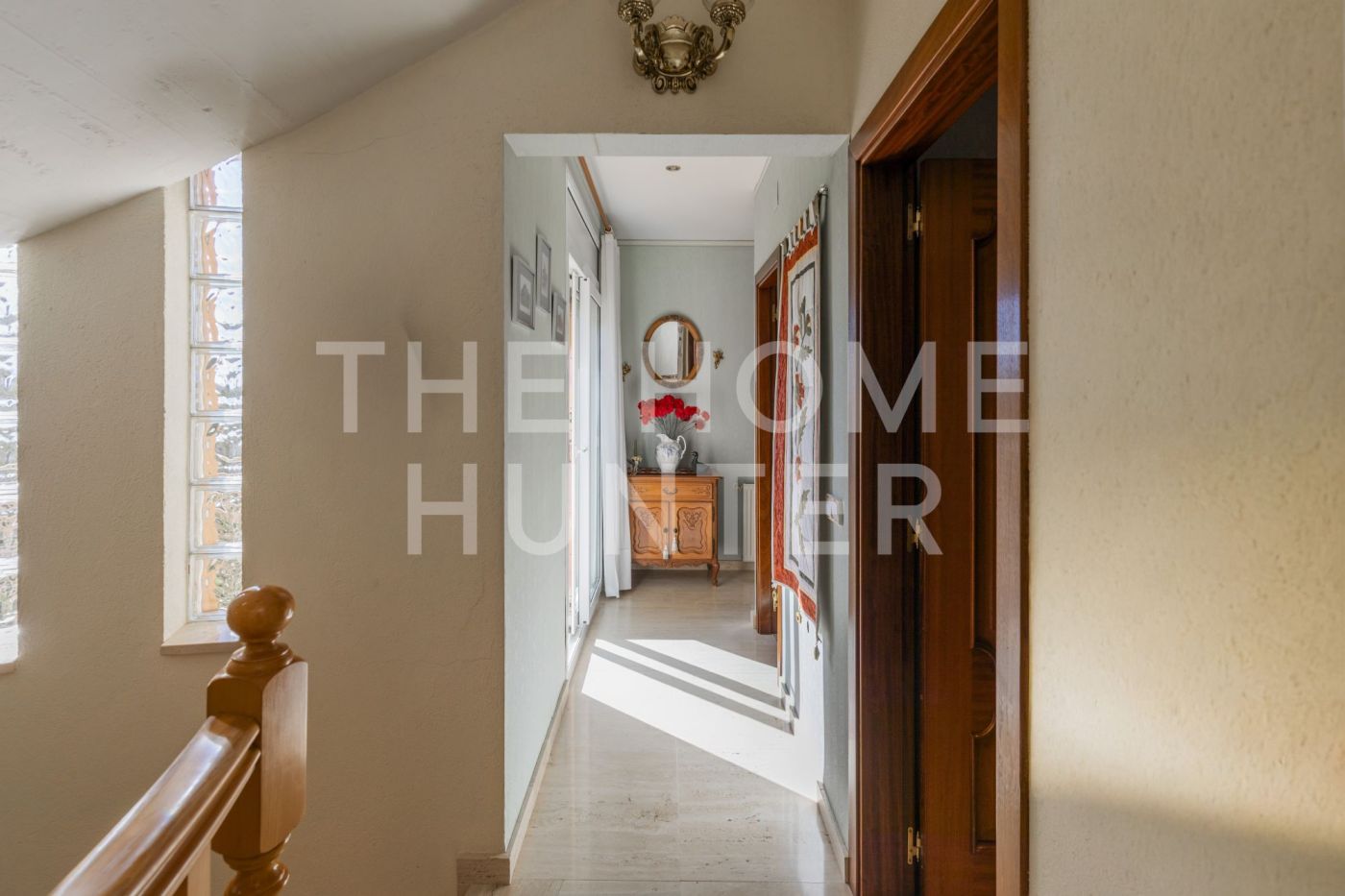 Esta casa de 312m² repercutidos se encuentra en una parcela de 949m² y tiene tres plantas. En la principal hay amplio salón-comedor con chimenea y salida a terraza de 30m², cocina office equipada, dos dormitorios dobles con vistas al jardín, un baño completo, un aseo y armarios empotrados. En la primera planta se encuentra la master suite con baño y un pequeño salón con salida a terraza con vistas. En la planta inferior hay un dormitorio con salida al jardín y una sala polivalente con un baño completo. Tiene ventanas de climalit doble, un garaje tipo box para dos coches y una zona comunitaria con piscina y pista de tenis. La finca es de 1978.