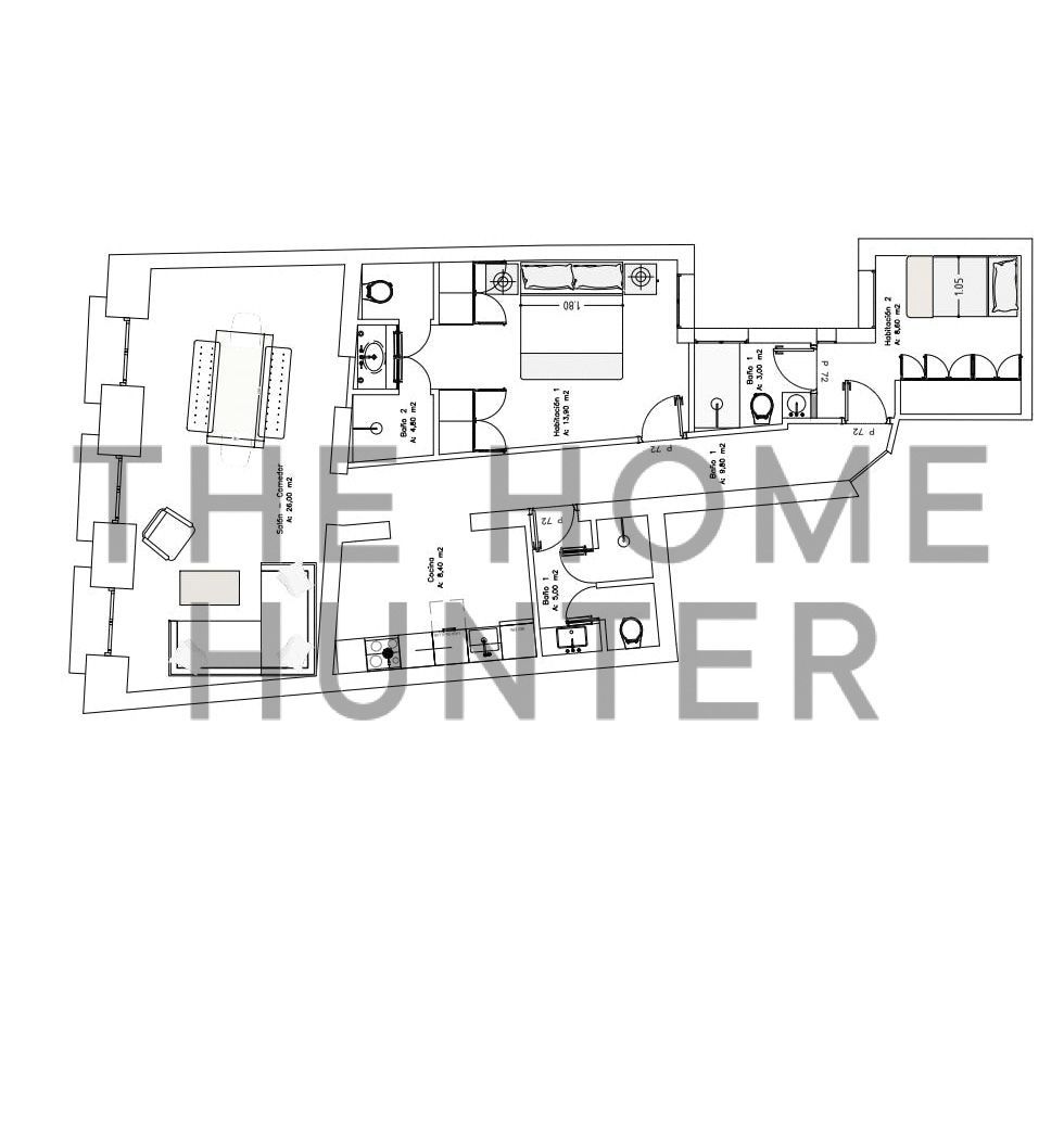 Este piso de 139m² construidos es una primera planta. Cuenta con dos dormitorios, tres baños (dos en suite), amplio salón-comedor con tres balcones, cocina equipada e independiente y armarios empotrados. Tiene aire acondicionado frío/calor y se entrega reformado y amueblado. La finca, de 1900, tiene ascensor.